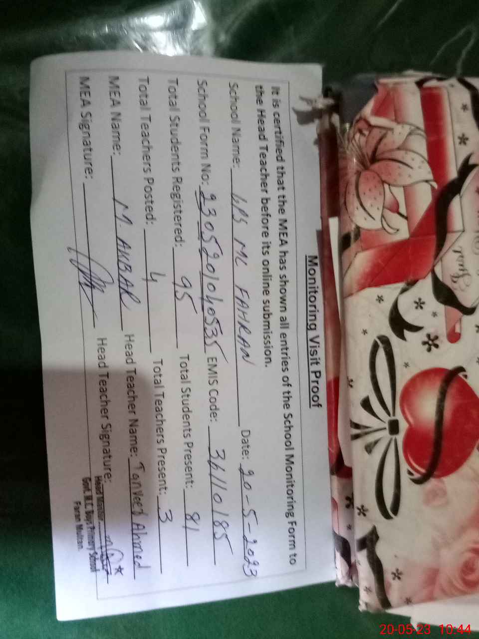 | EMIS Code: 36110185 | Name of School: GPS MC FARAAN NEAR KHONI BURJ MULTAN | |||