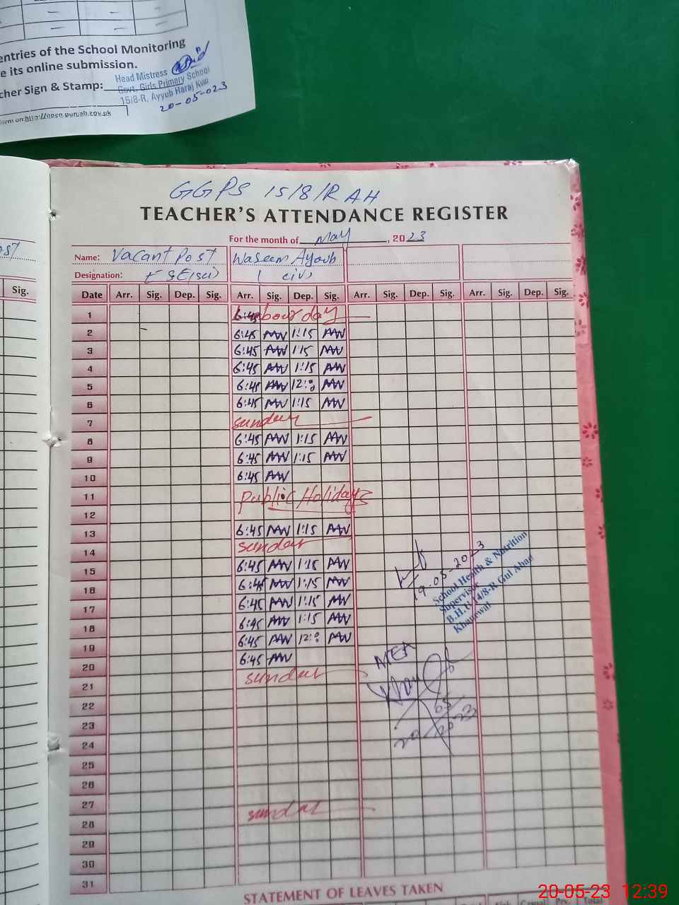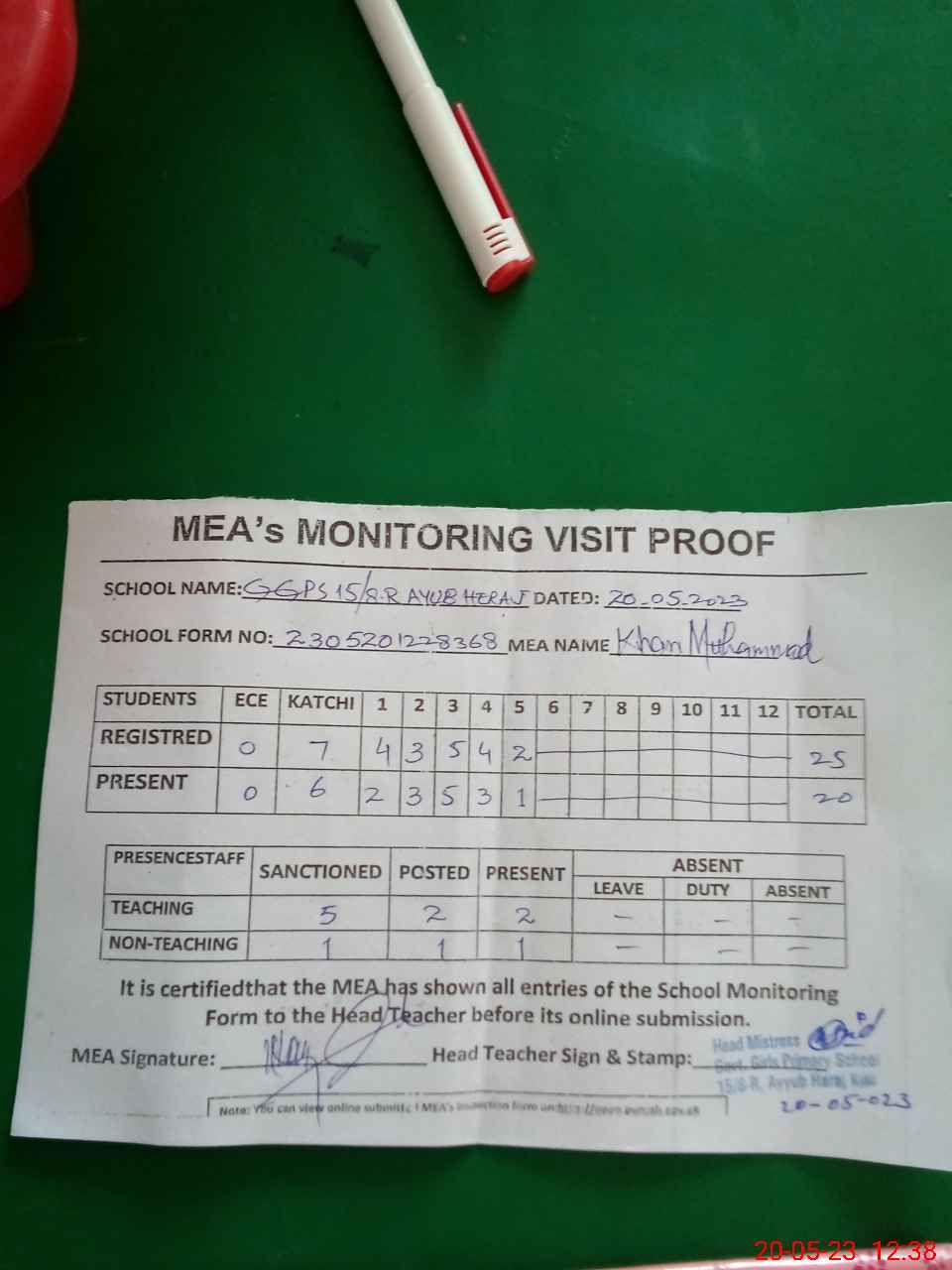 | Attendance Register | Head Teacher | MEA with School | Visit Proof |
