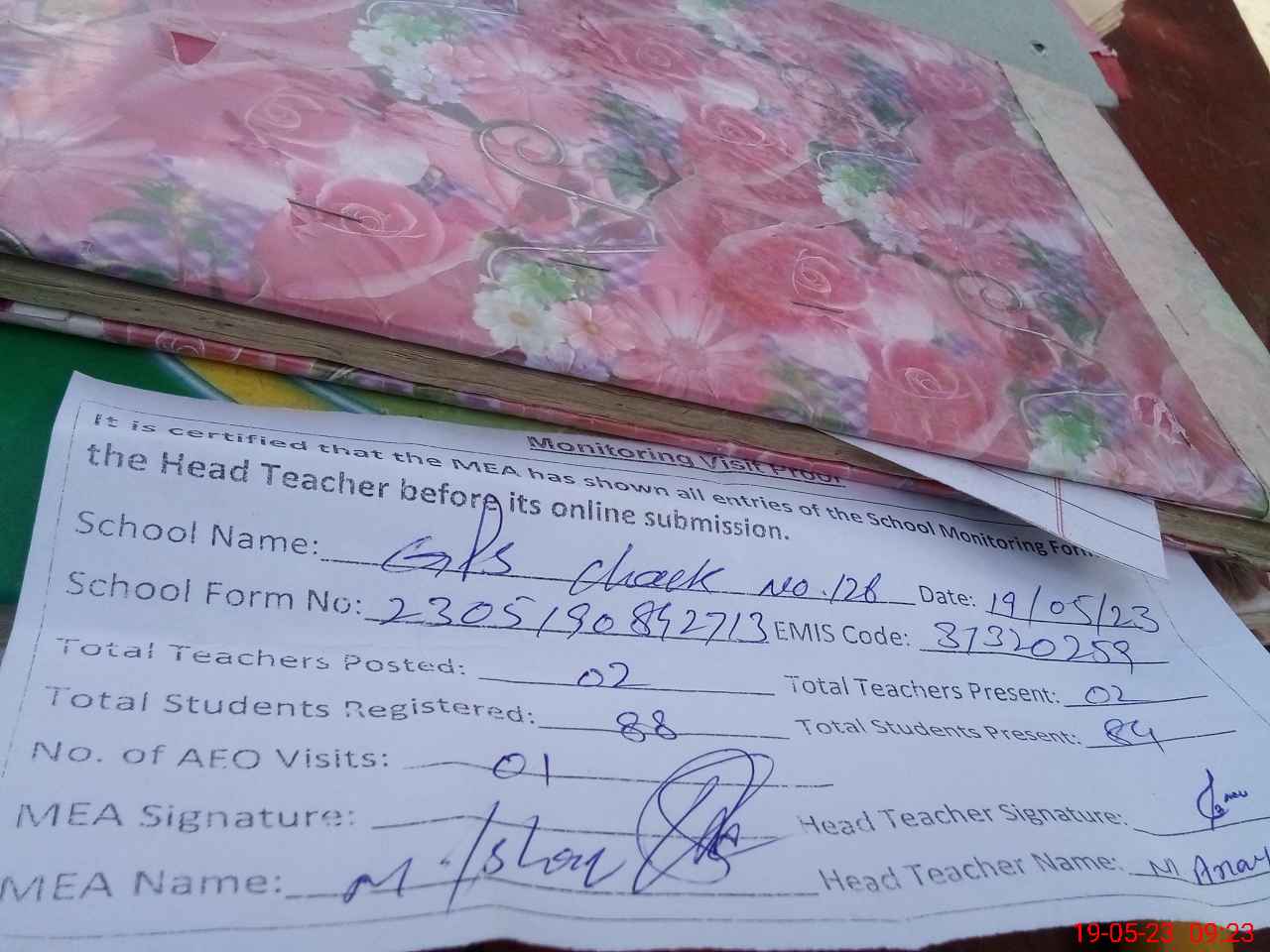 | Attendance Register | Head Teacher | MEA with School | Visit Proof |