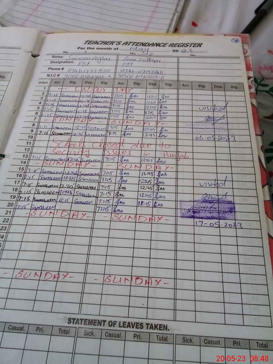 | Name: SA**** AS**** Designation: (School Headmaster's/Headmistress's) PST Phone/Cell Number: 03**** |