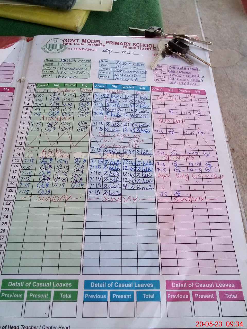 | CNIC | Full Name | Designation | R/C | Absence During Last Calender Month |