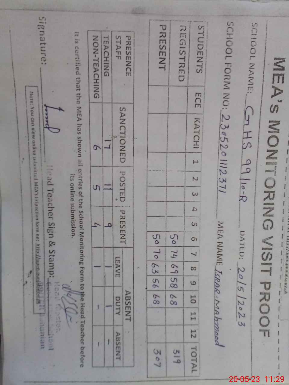 | Attendance Register | Head Teacher | MEA with School | Visit Proof |