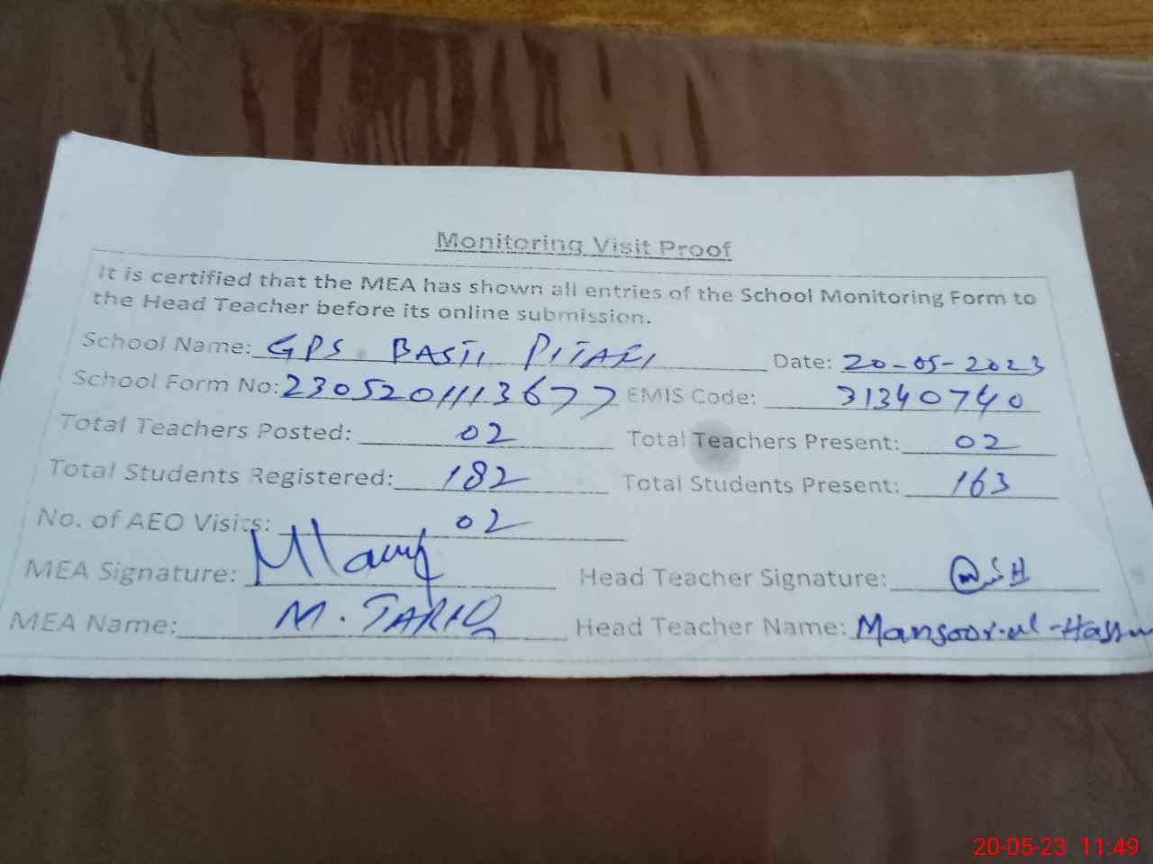 | Attendance Register | Head Teacher | MEA with School | Visit Proof |