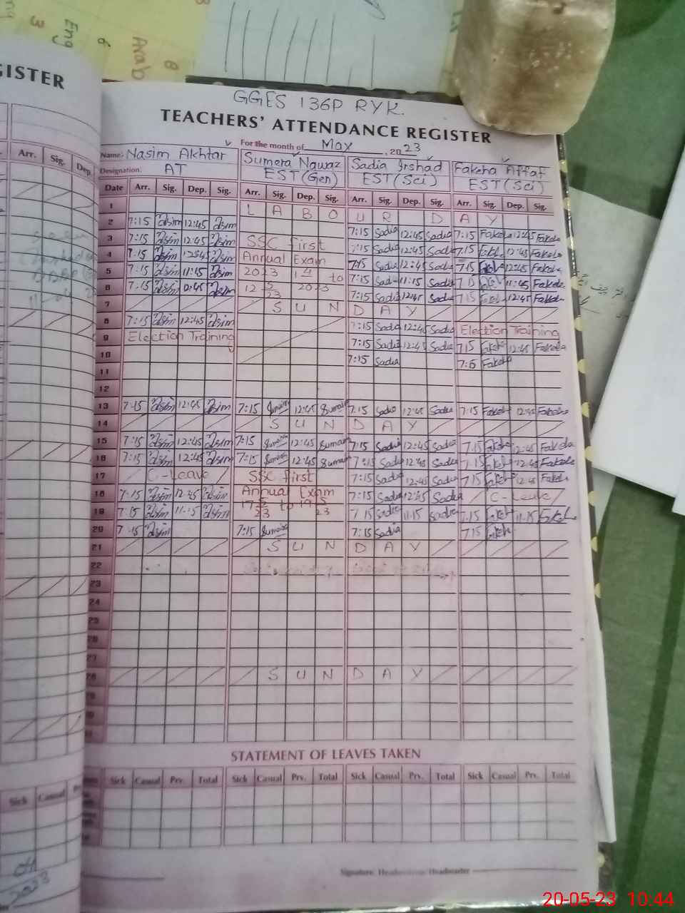 | Name: Sa**** Ir**** Designation: (School Headmaster's/Headmistress's) EST Phone/Cell Number: 03**** |
