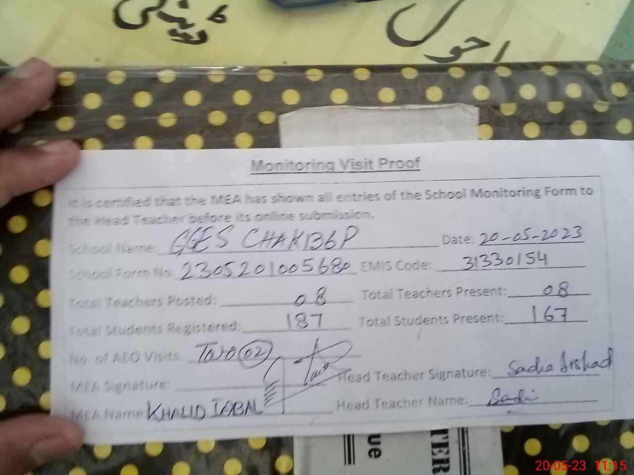 | Attendance Register | Head Teacher | MEA with School | Visit Proof |