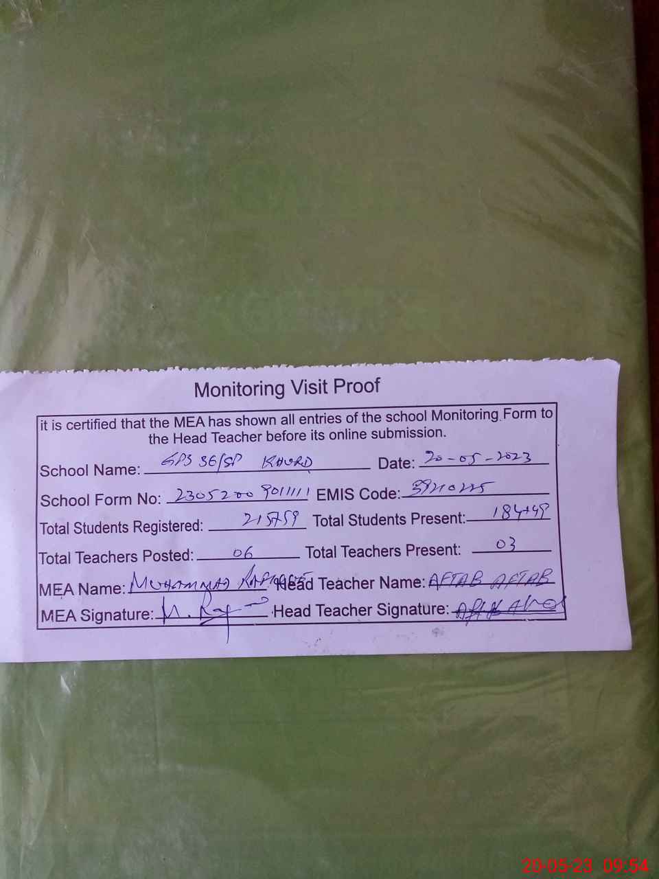 | Attendance Register | Head Teacher | MEA with School | Visit Proof |
