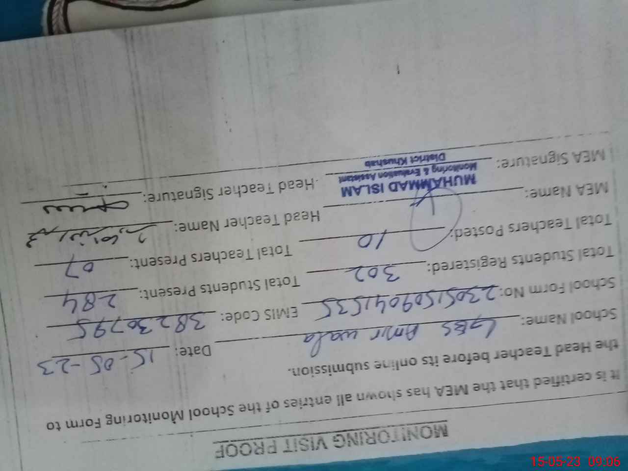 | Name: Mu**** Sa**** Designation: (School Headmaster's/Headmistress's) S S T Gen Phone/Cell Number: 03**** |
