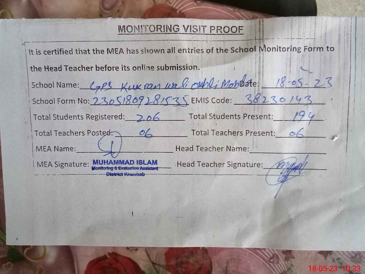 | Attendance Register | Head Teacher | MEA with School | Visit Proof |