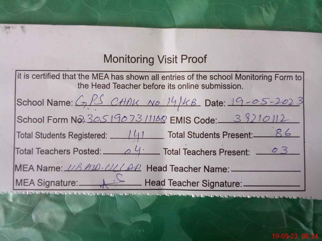 | Attendance Register | Head Teacher | MEA with School | Visit Proof |