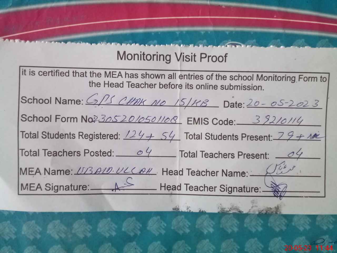 | EMIS Code: 39210114 | Name of School: GPS CHAK NO 15 KB | |||