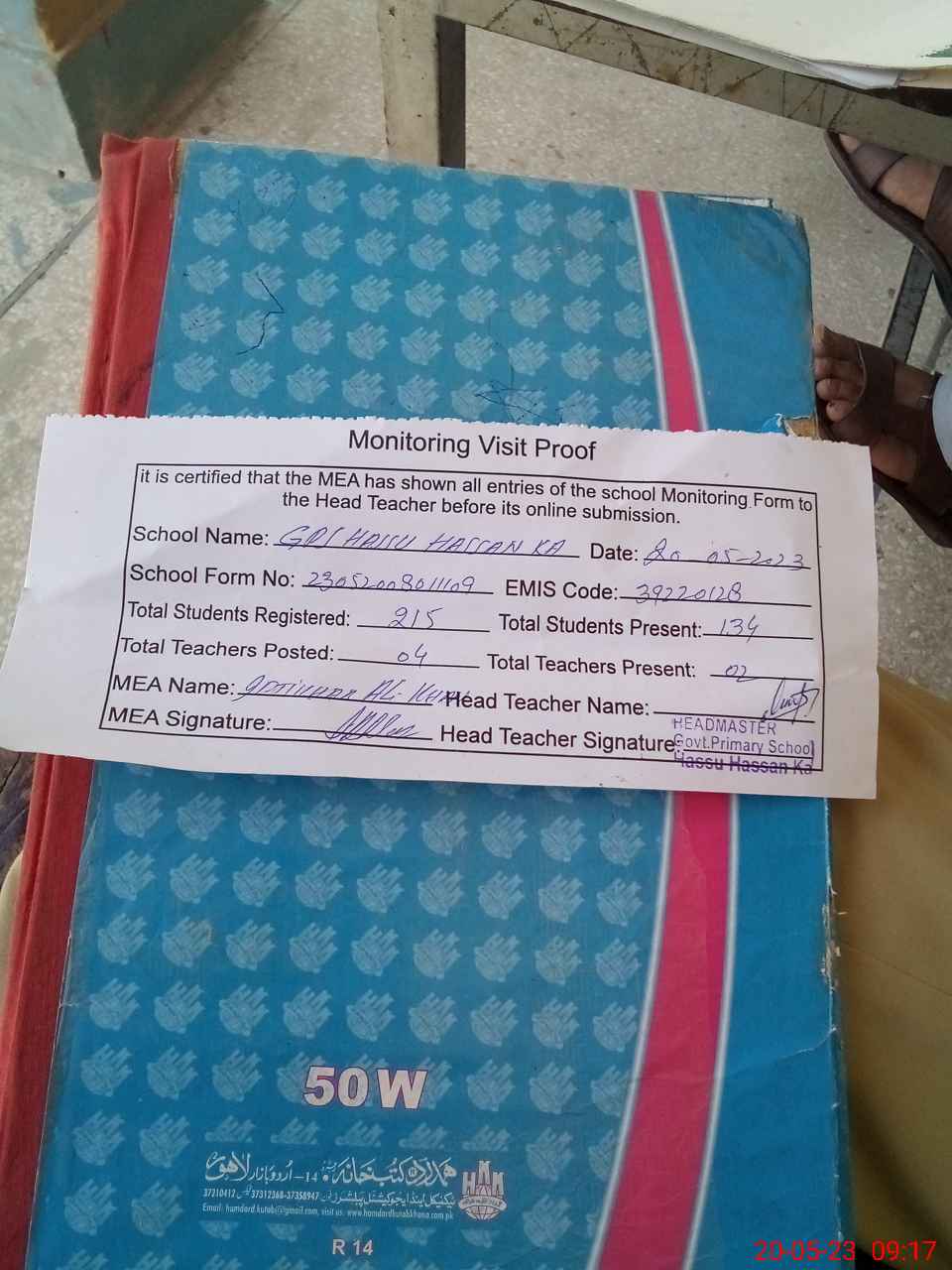 | Attendance Register | Head Teacher | MEA with School | Visit Proof |