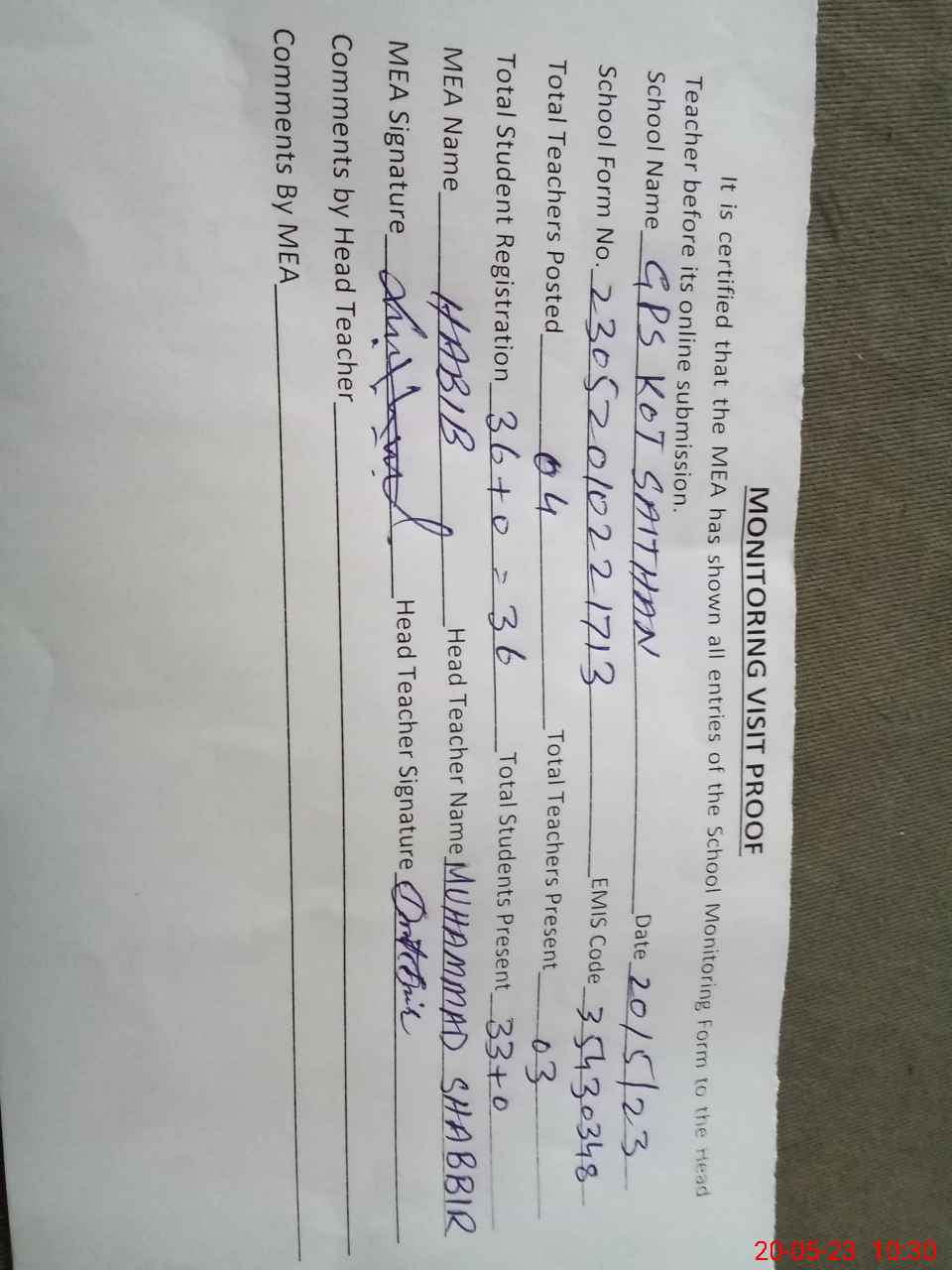 | Attendance Register | Head Teacher | MEA with School | Visit Proof |