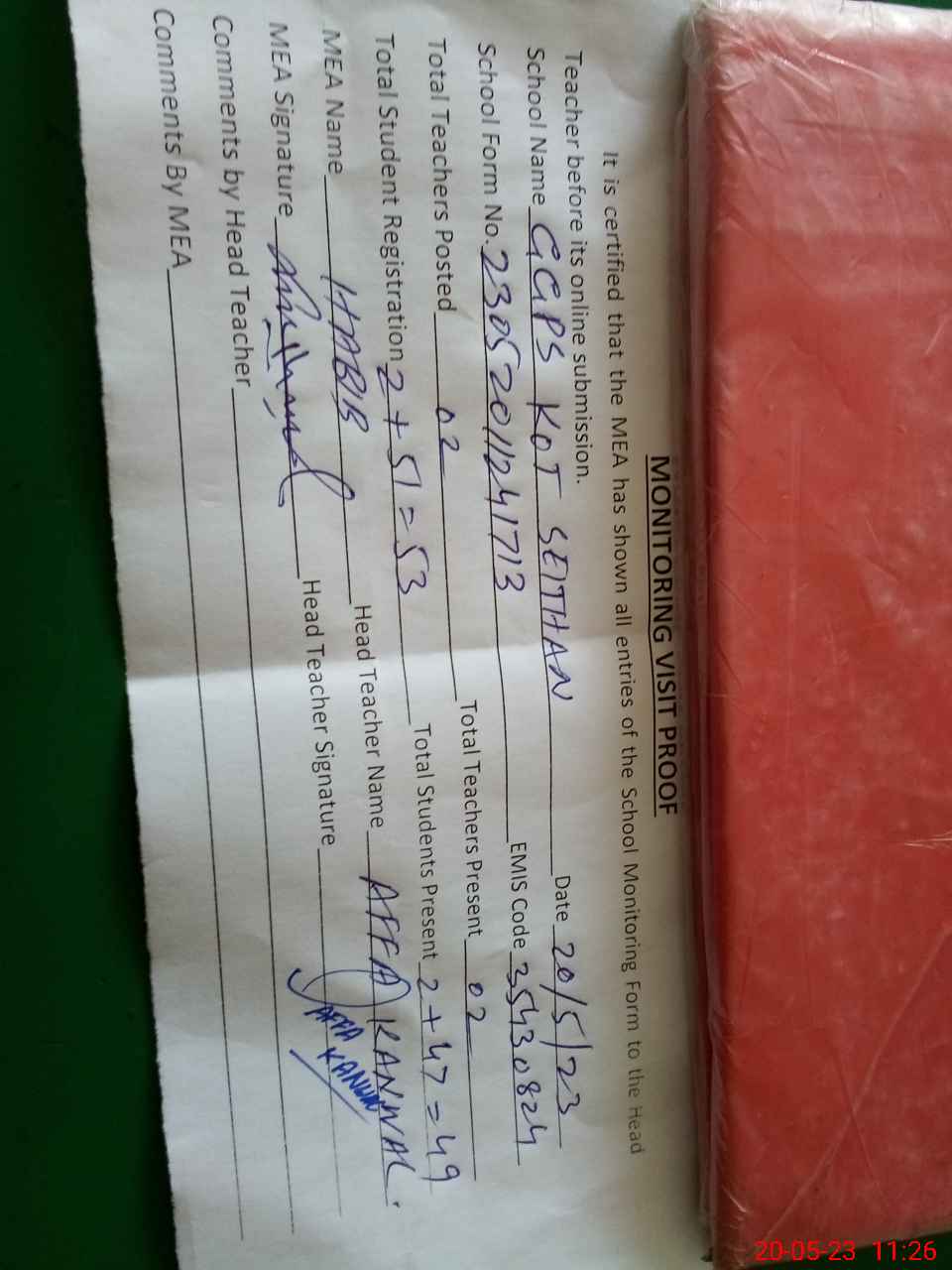 | Attendance Register | Head Teacher | MEA with School | Visit Proof |
