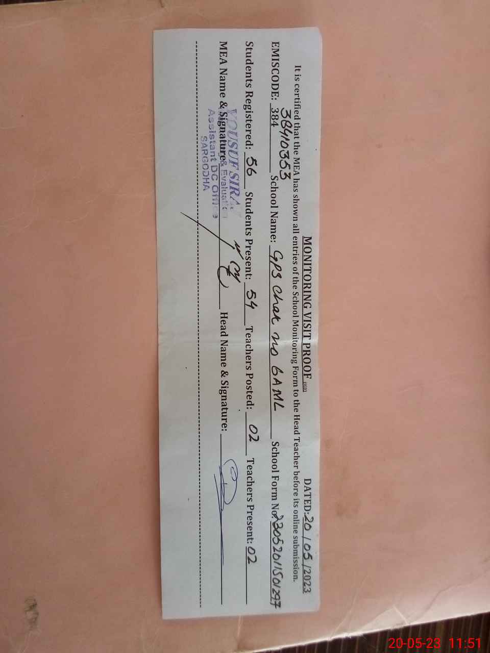 | Attendance Register | Head Teacher | MEA with School | Visit Proof |