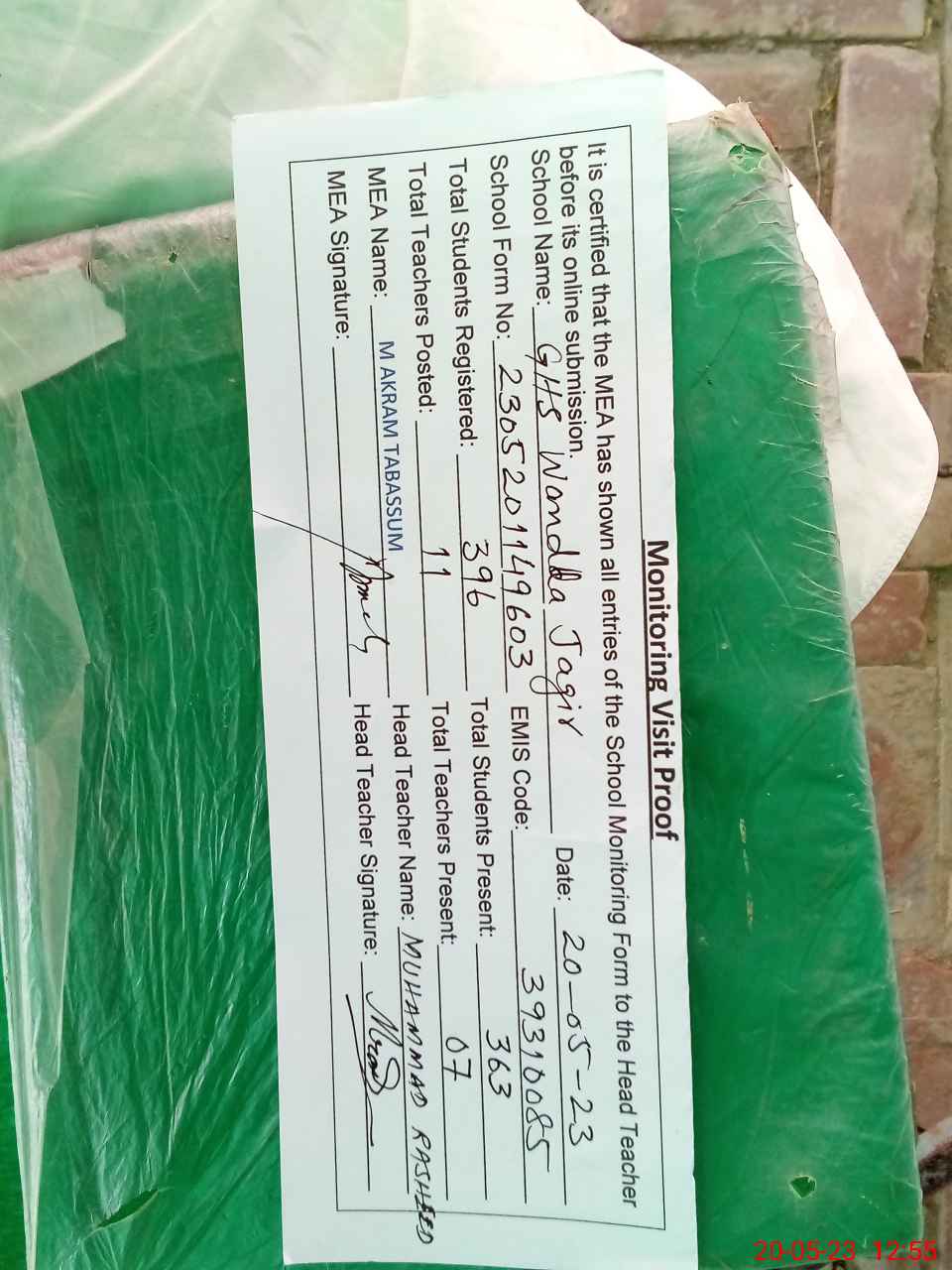 | Attendance Register | Head Teacher | MEA with School | Visit Proof |