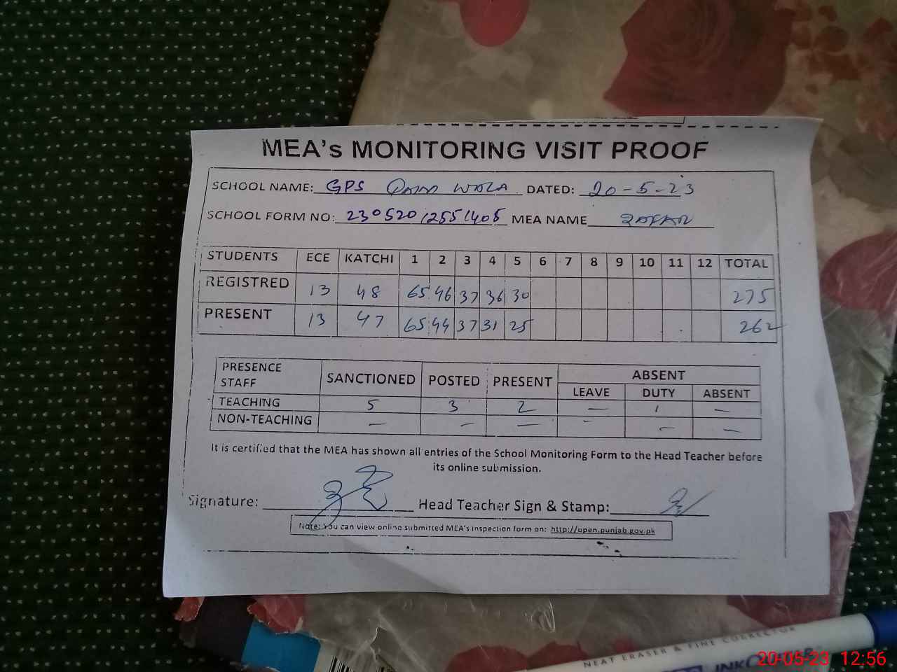 | Attendance Register | Head Teacher | MEA with School | Visit Proof |