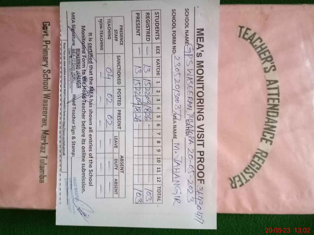 | Attendance Register | Head Teacher | MEA with School | Visit Proof |
