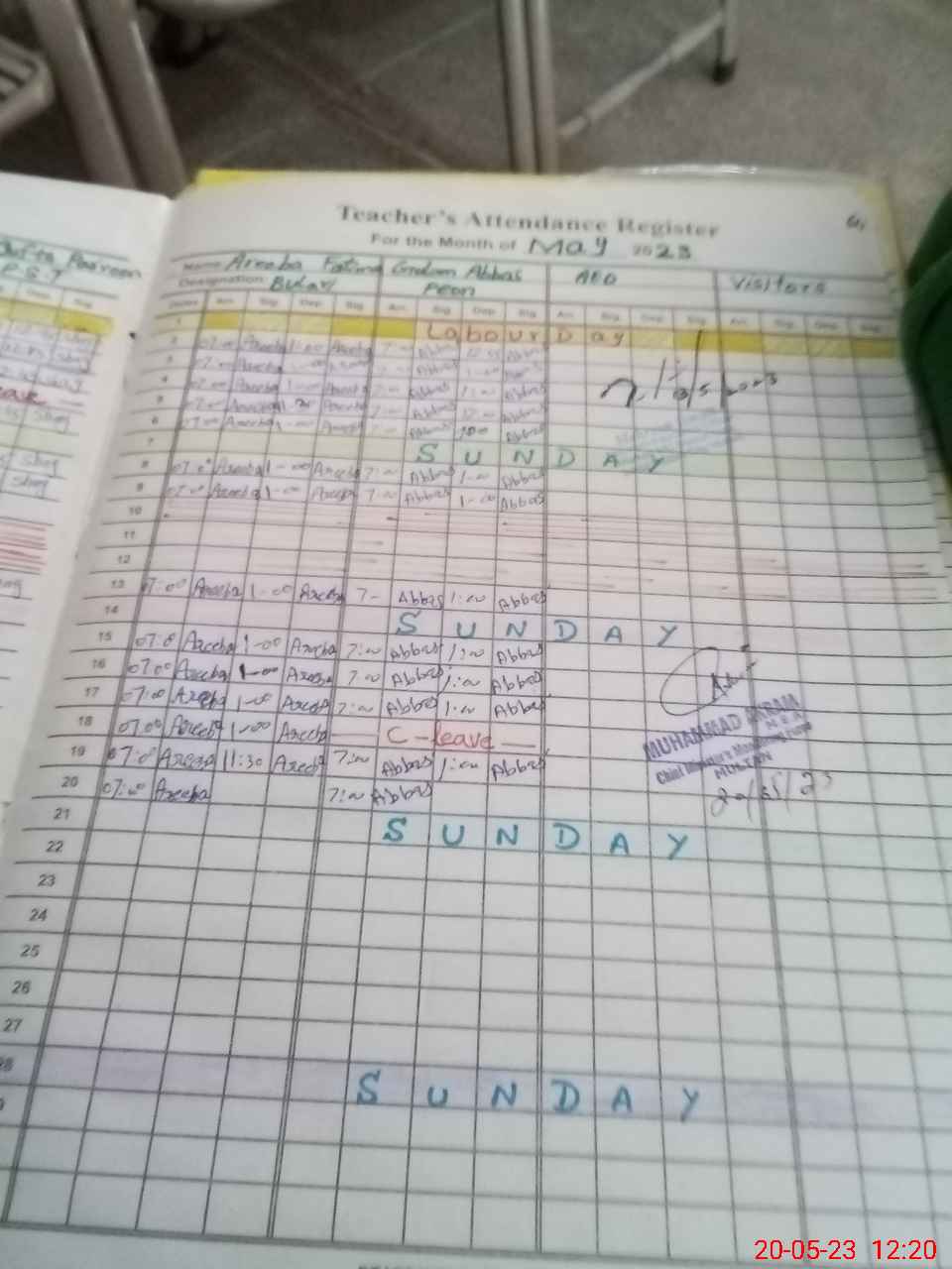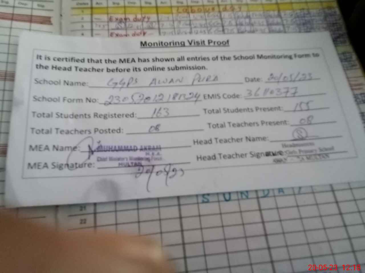 | Attendance Register | Head Teacher | MEA with School | Visit Proof |