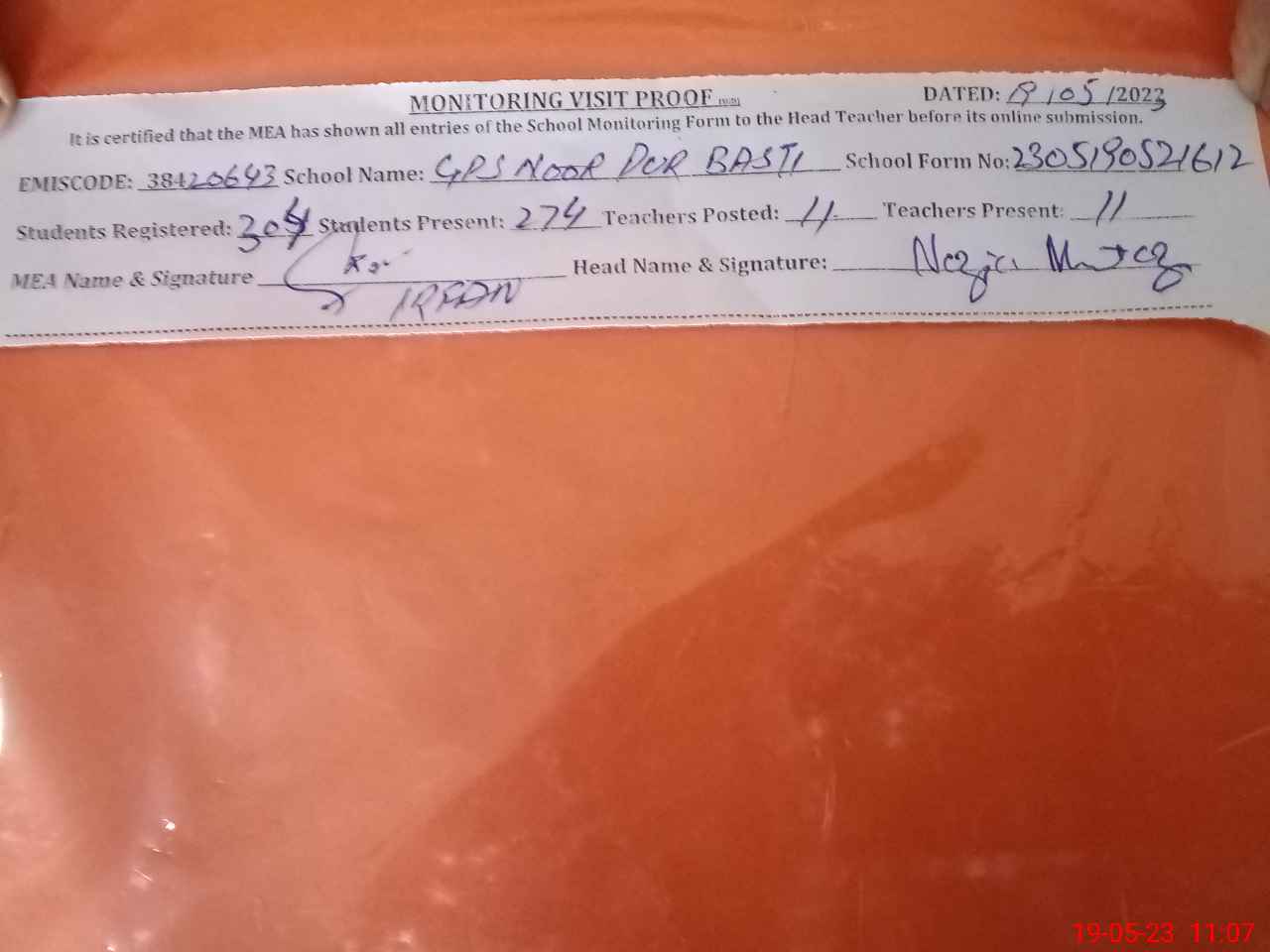 | Attendance Register | Head Teacher | MEA with School | Visit Proof |