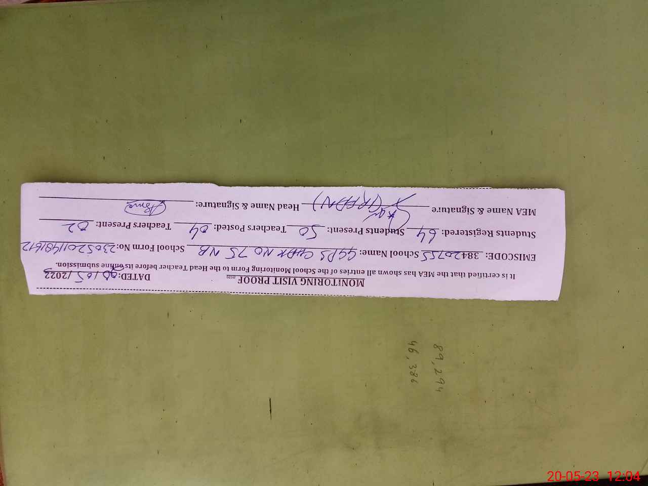 | Attendance Register | Head Teacher | MEA with School | Visit Proof |