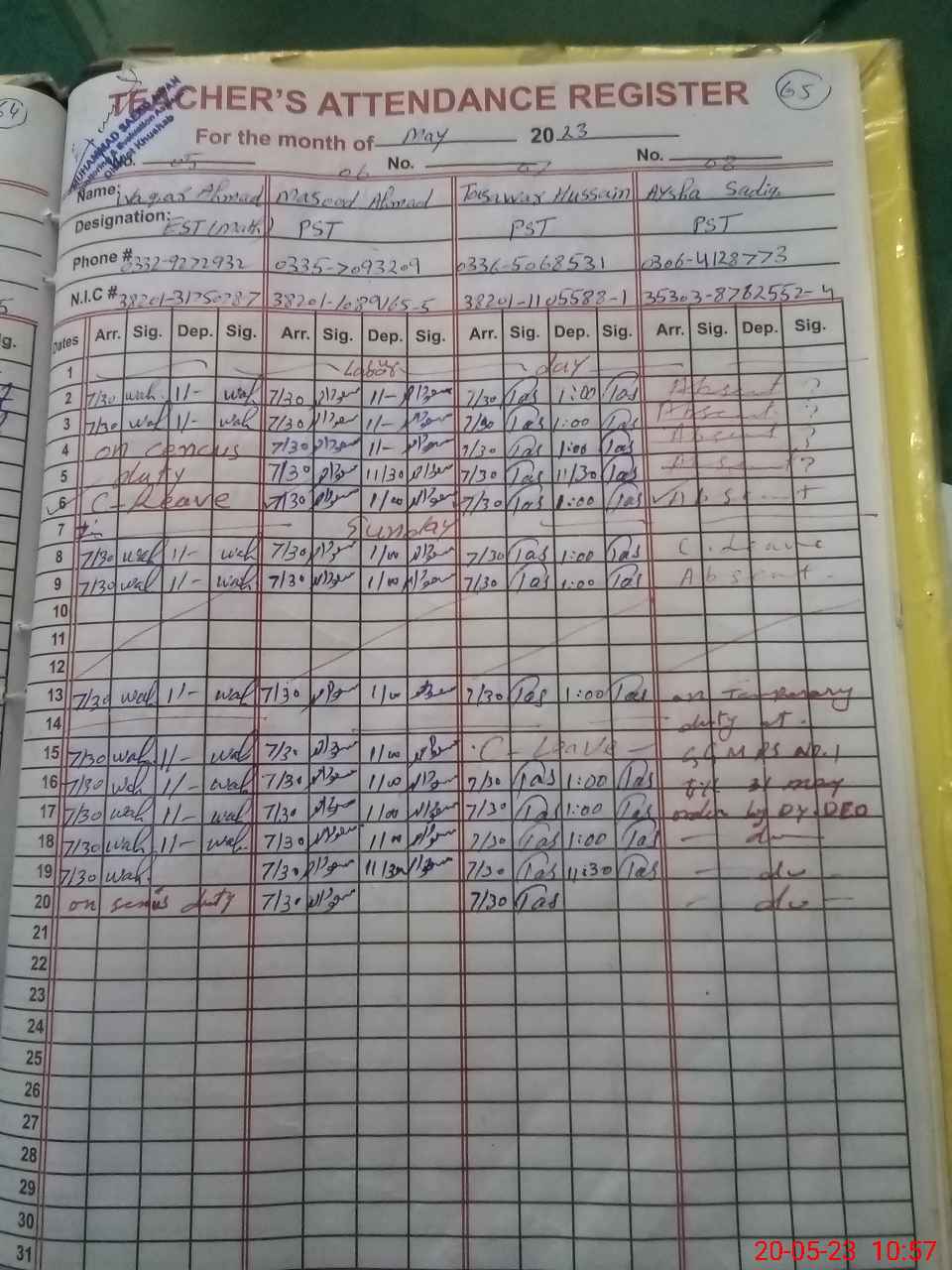 | CNIC | Full Name | Designation | R/C | Absence During Last Calender Month |