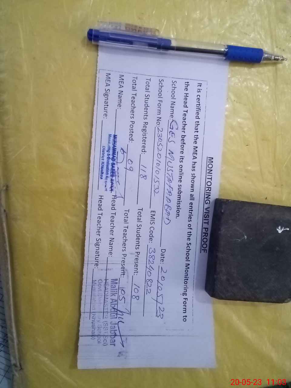 | Attendance Register | Head Teacher | MEA with School | Visit Proof |