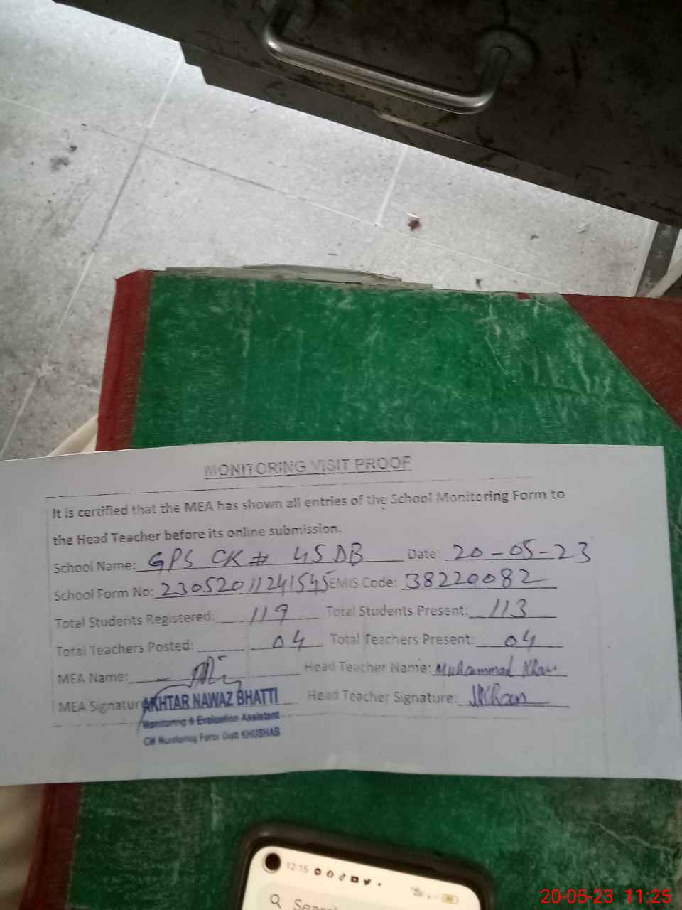 | EMIS Code: 38220082 | Name of School: GPS CHAK NO. 45/DB | |||