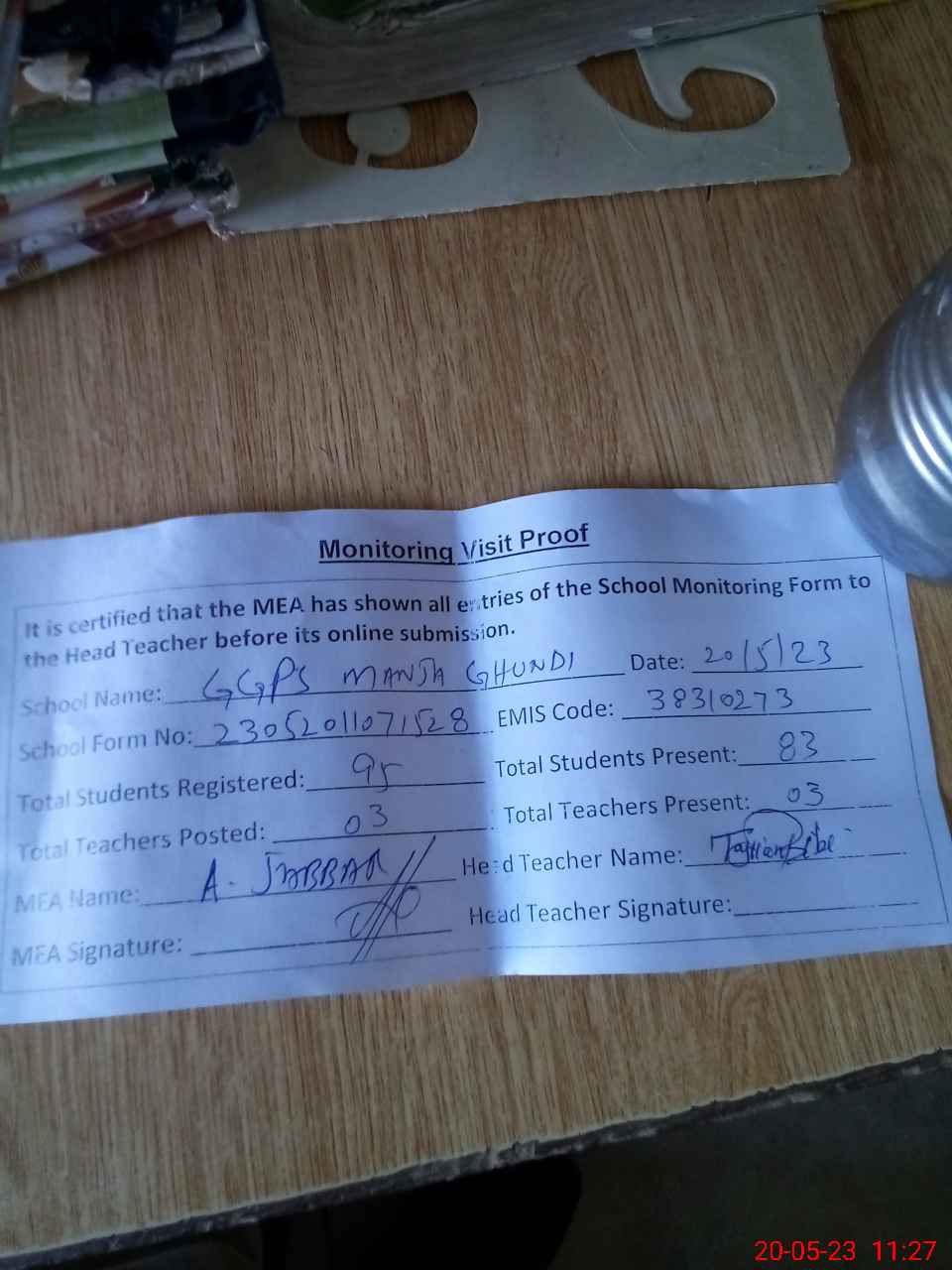 | Attendance Register | Head Teacher | MEA with School | Visit Proof |