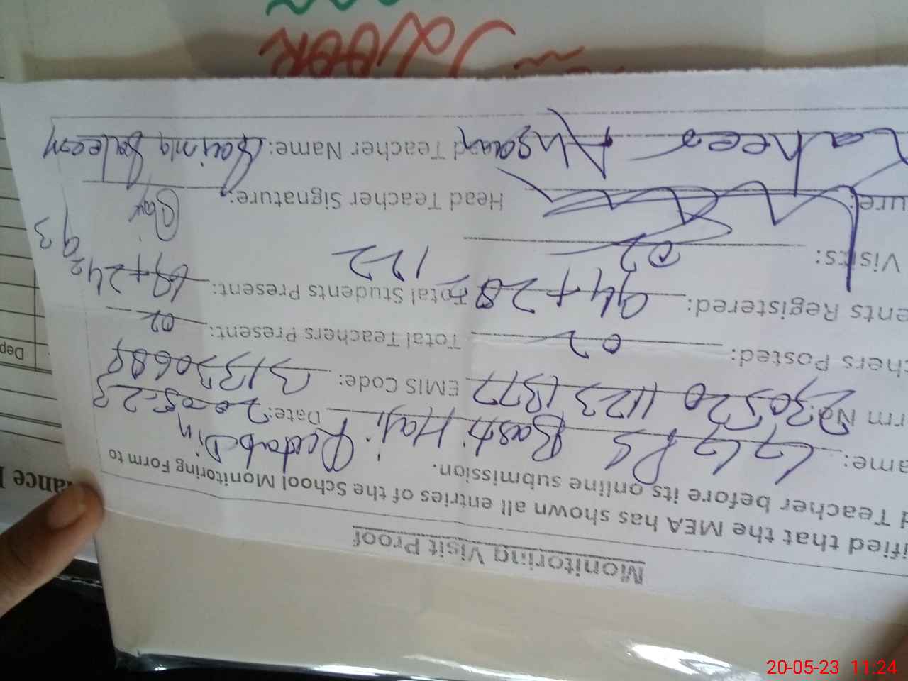 | Attendance Register | Head Teacher | MEA with School | Visit Proof |