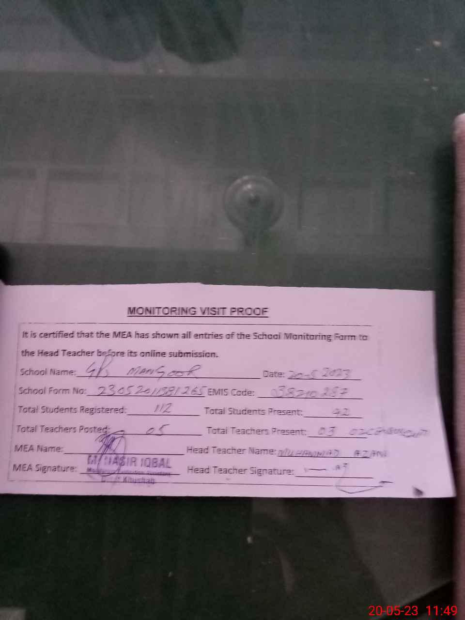 | Attendance Register | Head Teacher | MEA with School | Visit Proof |