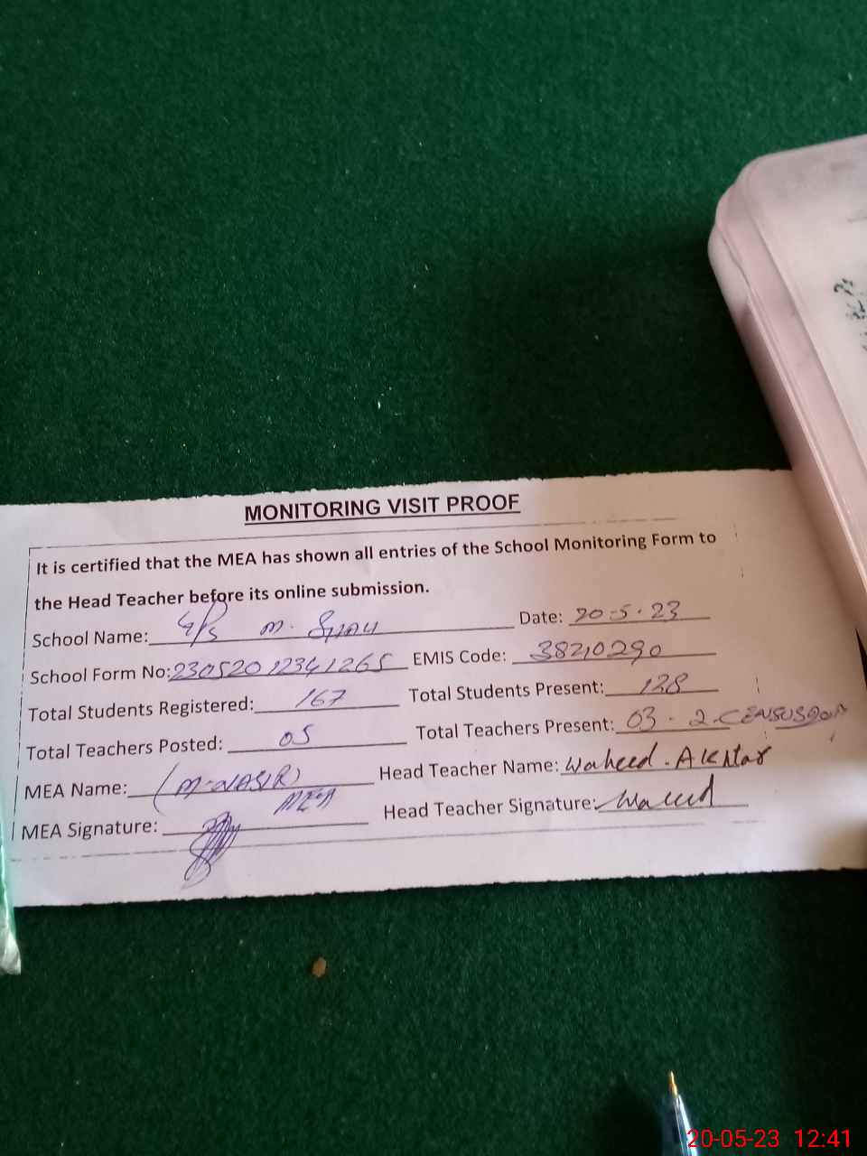 | Attendance Register | Head Teacher | MEA with School | Visit Proof |