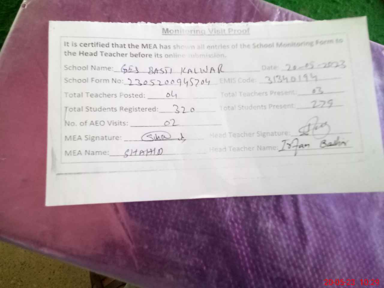 | Attendance Register | Head Teacher | MEA with School | Visit Proof |