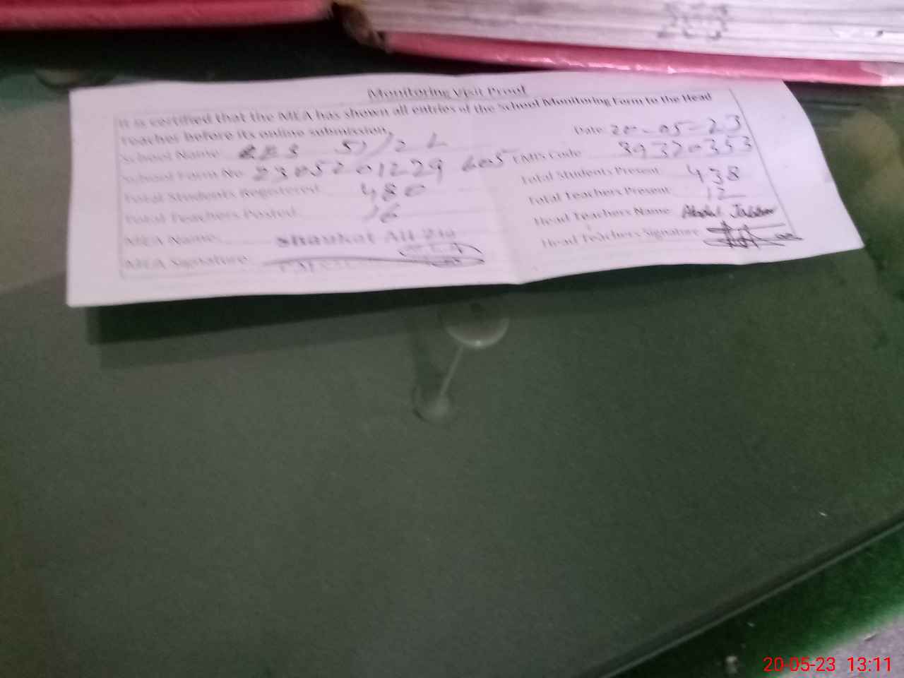 | Attendance Register | Head Teacher | MEA with School | Visit Proof |