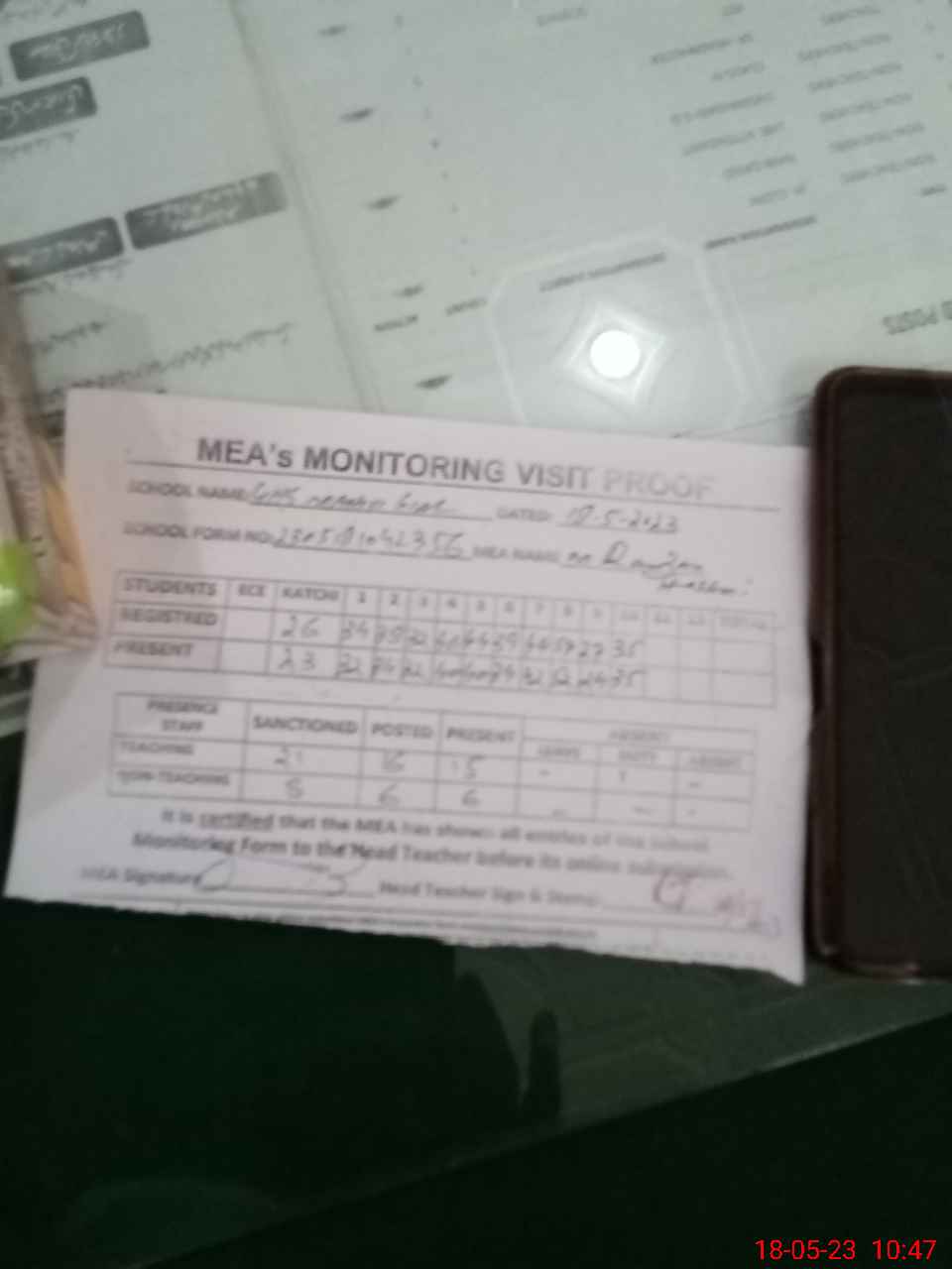 | Attendance Register | Head Teacher | MEA with School | Visit Proof |