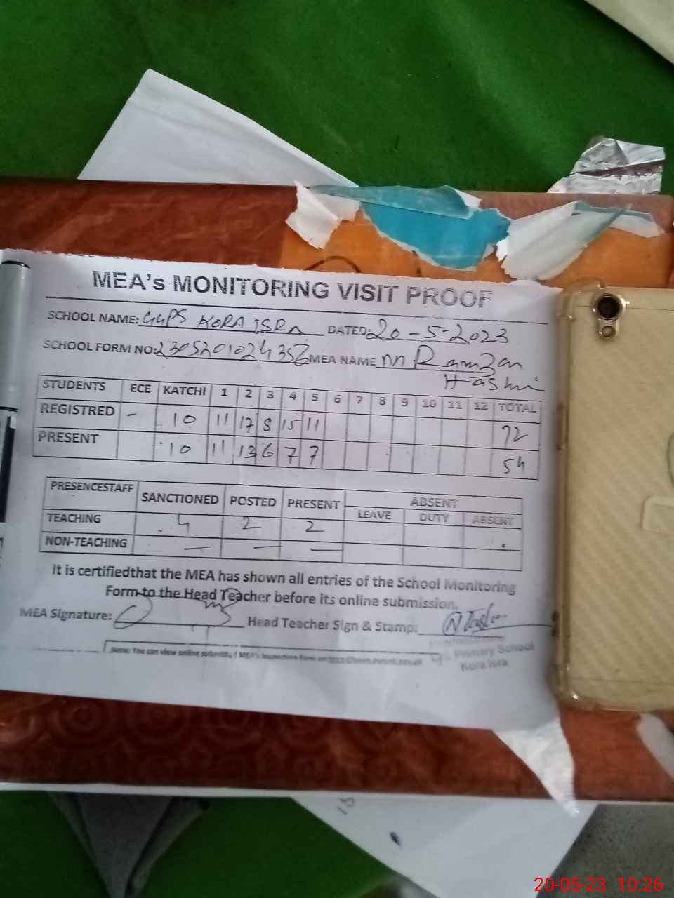 | Attendance Register | Head Teacher | MEA with School | Visit Proof |