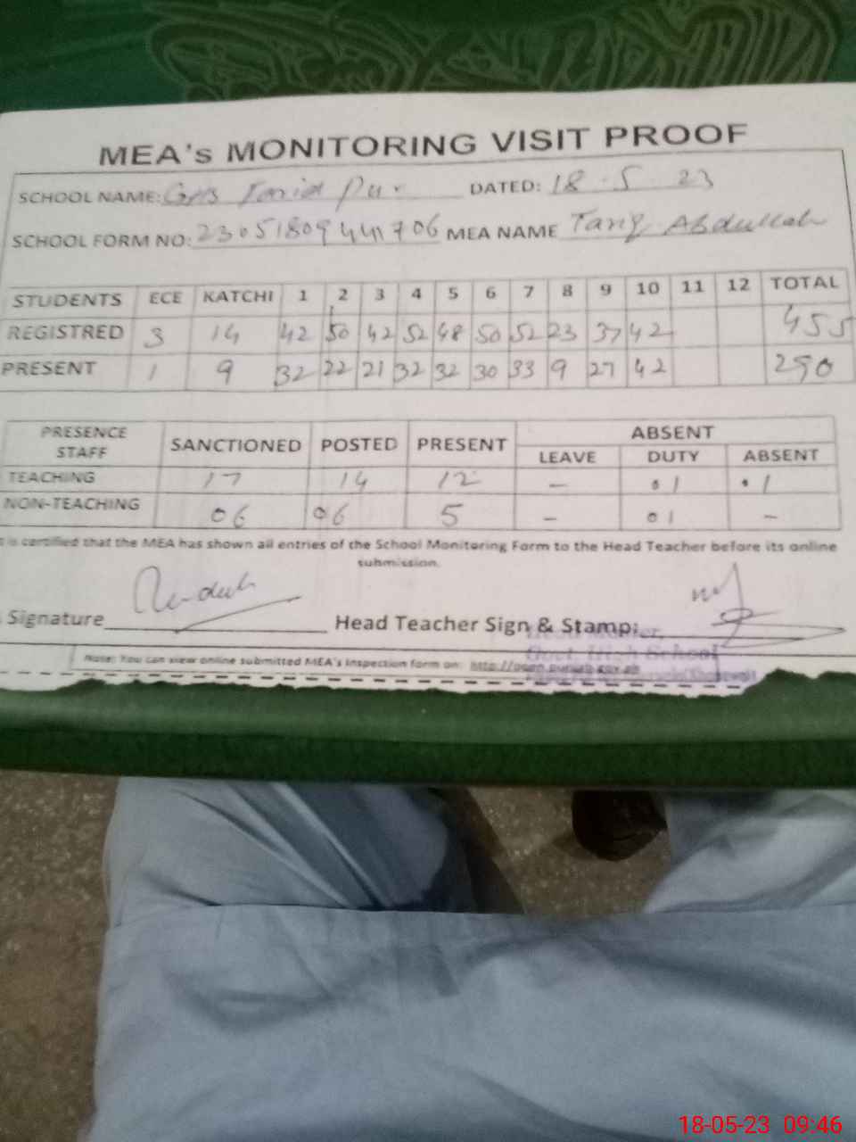 | Certified that this School was Inspected by the Undersigned MEA/DMO Today and the Information Stated Above is as Per Record. | |||||