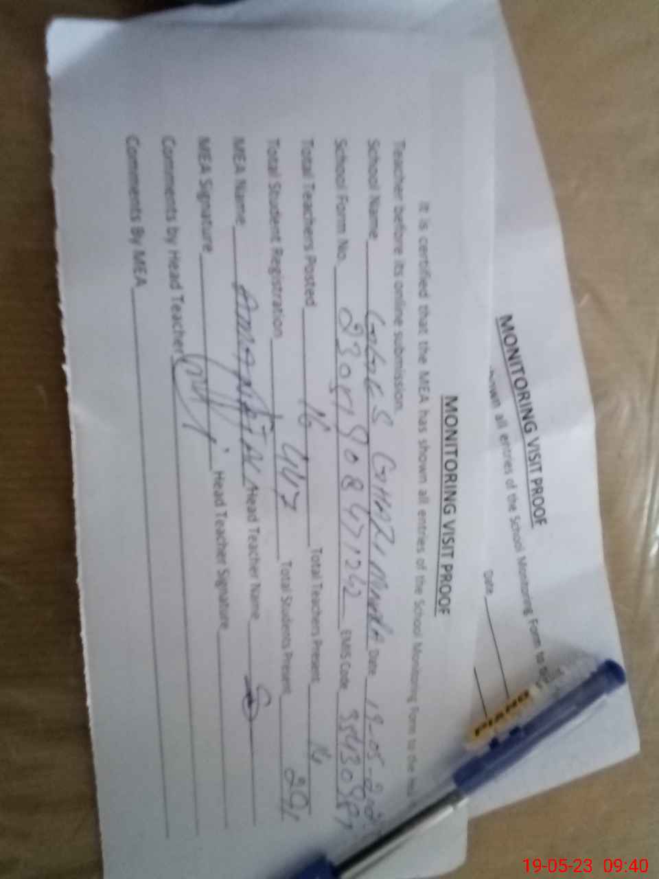 | Attendance Register | Head Teacher | MEA with School | Visit Proof |
