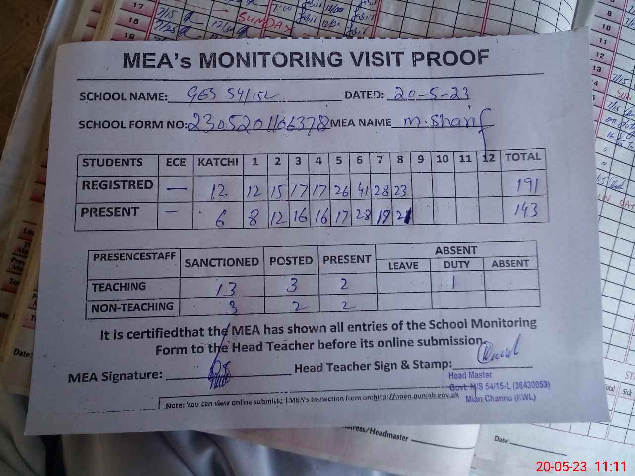 | EMIS Code: 36430053 | Name of School: GES 54/15-L, MIAN CHANNU | |||
