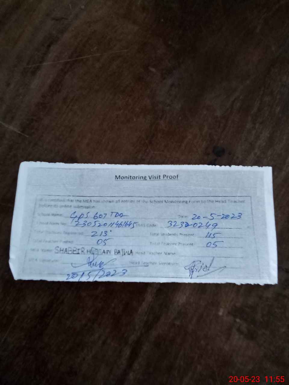 | Attendance Register | Head Teacher | MEA with School | Visit Proof |