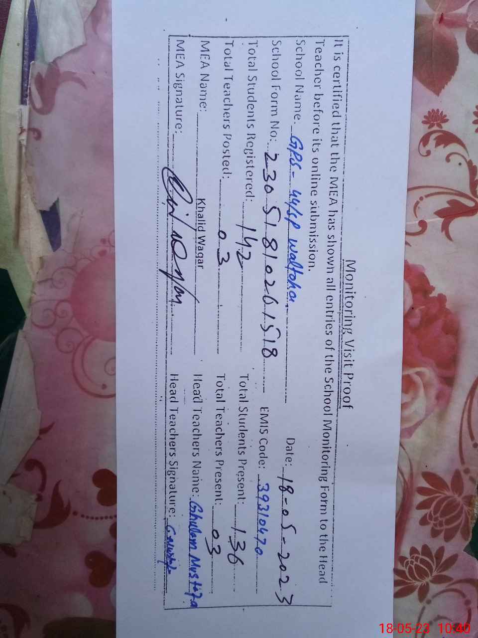 | Attendance Register | Head Teacher | MEA with School | Visit Proof |