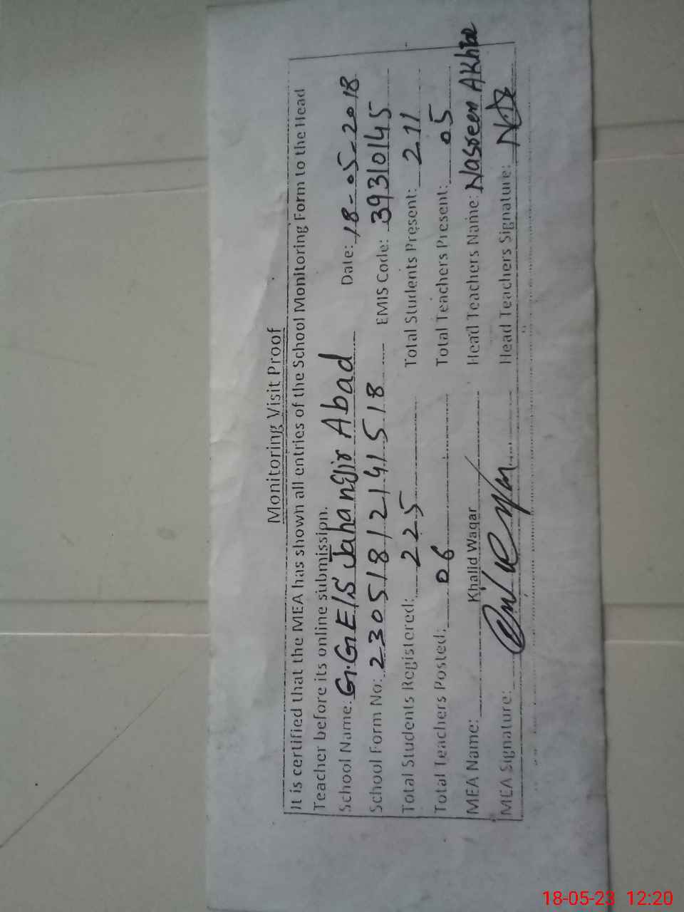 | Attendance Register | Head Teacher | MEA with School | Visit Proof |