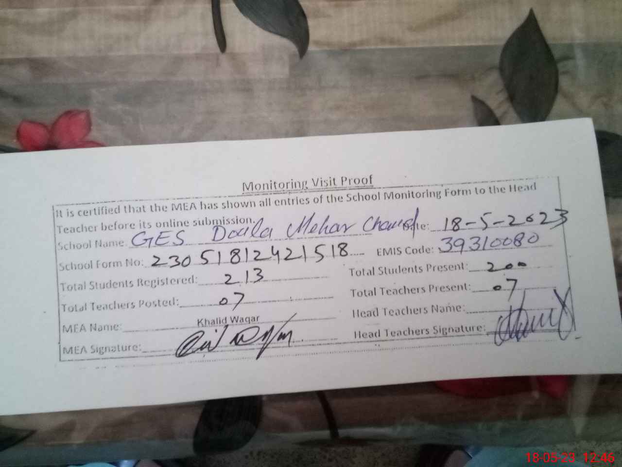| Attendance Register | Head Teacher | MEA with School | Visit Proof |