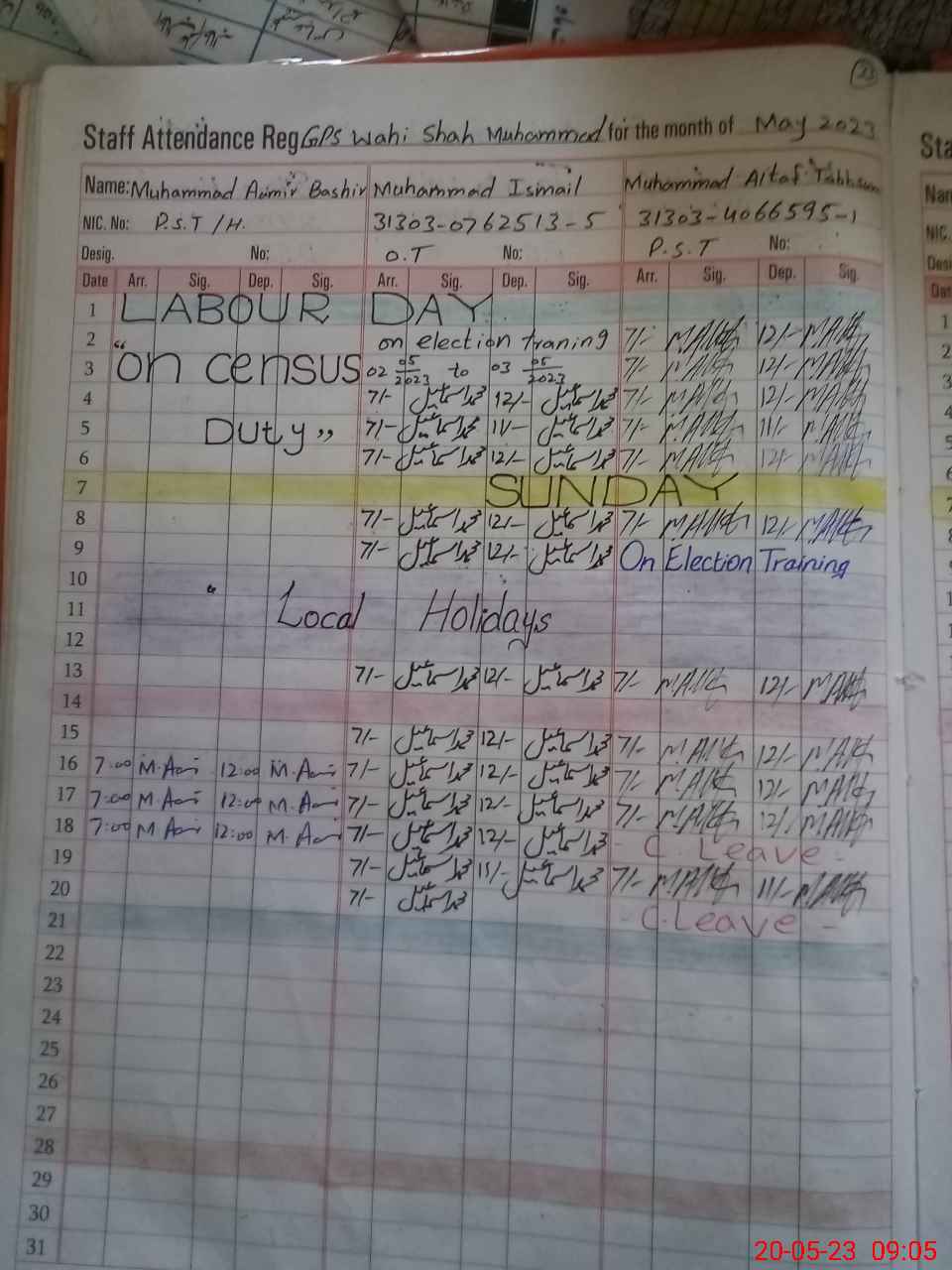 | CNIC | Full Name | Designation | R/C | Absence during last cal. month |