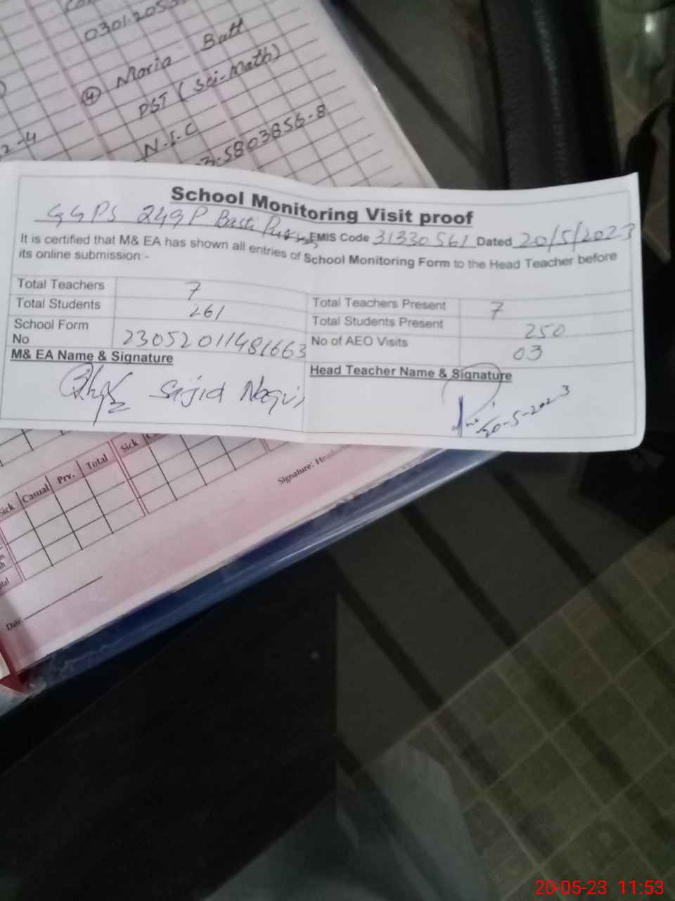 | Attendance Register | Head Teacher | MEA with School | Visit Proof |