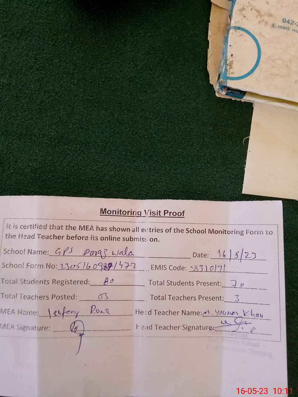 | Attendance Register | Head Teacher | MEA with School | Visit Proof |