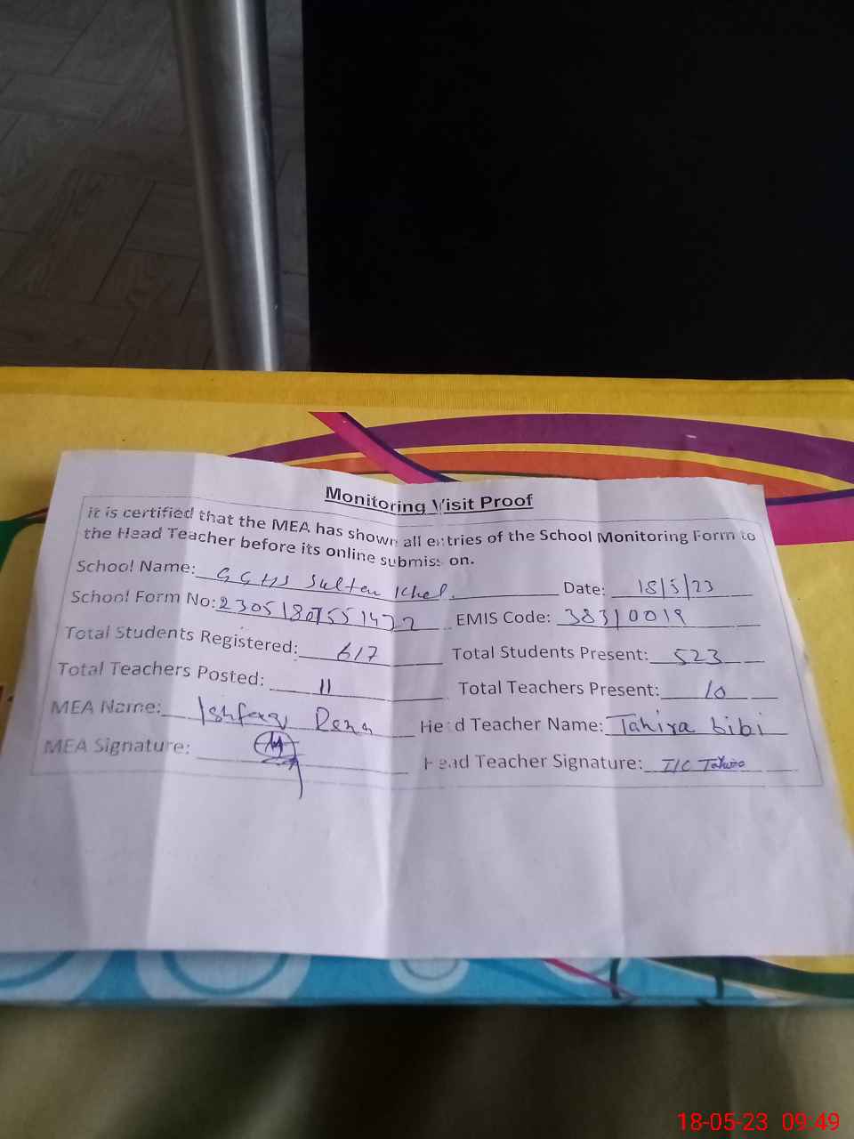 | Attendance Register | Head Teacher | MEA with School | Visit Proof |