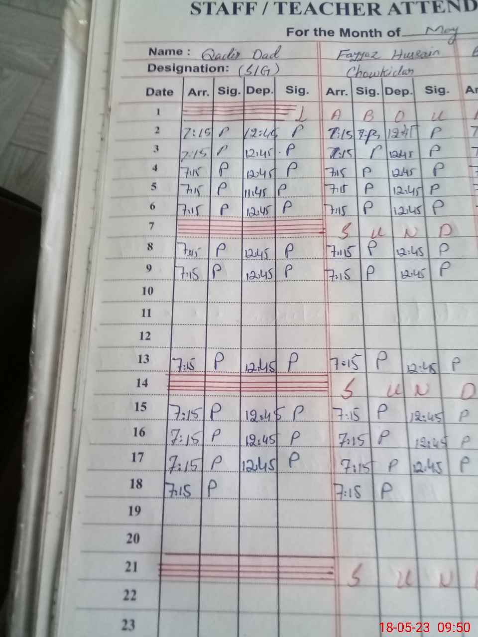 | Total no. of Classrooms: 14 No. of Classrooms Used for Teaching: 14 No. of Classrooms Storing Old Furniture, FTBs, etc: 0Comments if Any: Sg qadir dad found absent physically but marked present in attendance Register |