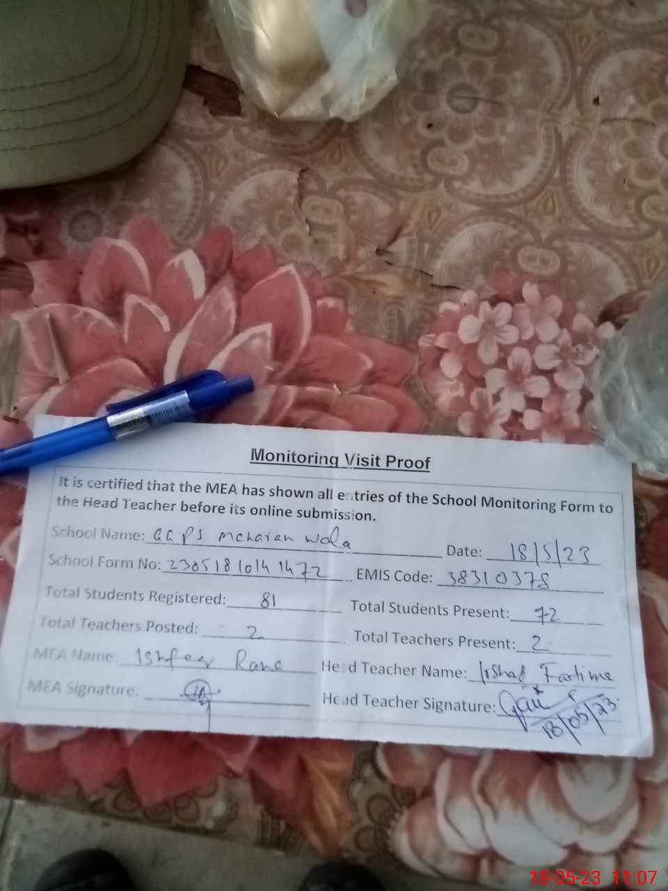 | Attendance Register | Head Teacher | MEA with School | Visit Proof |