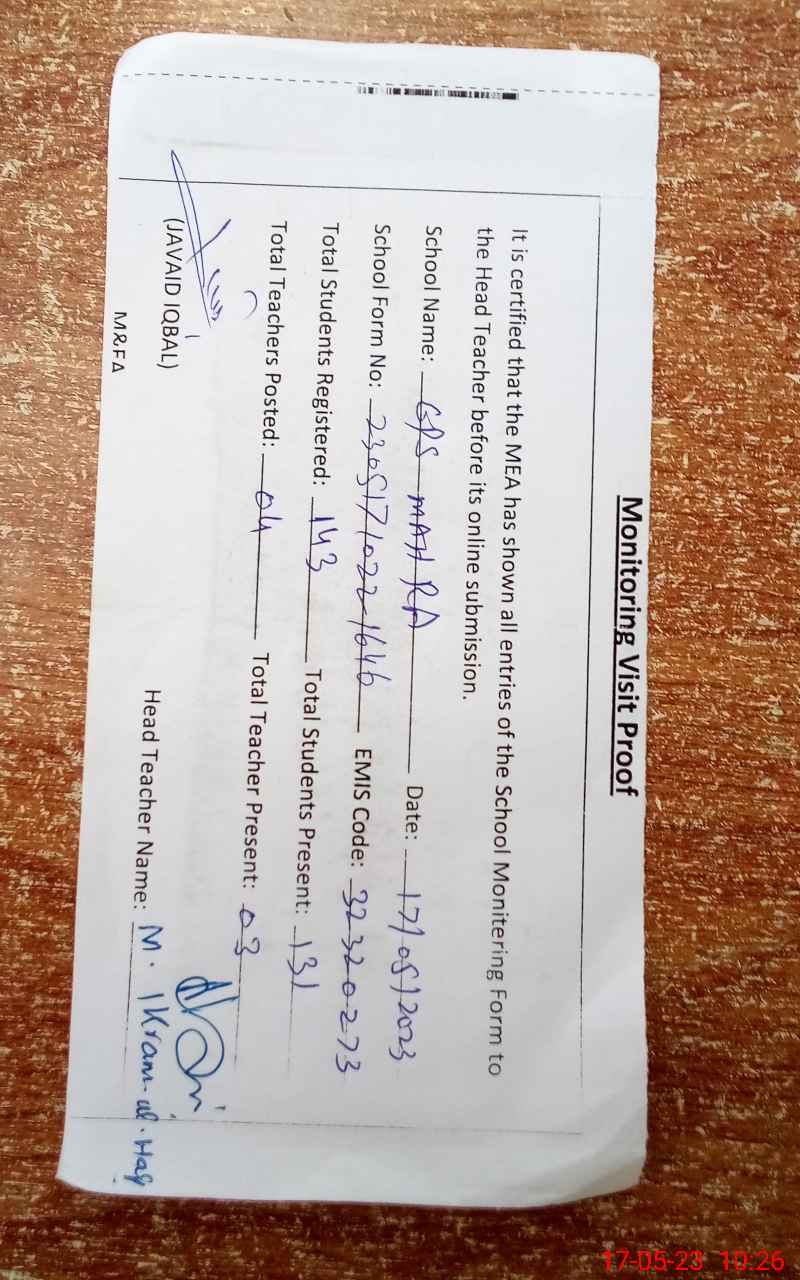 | EMIS Code: 32320273 | Name of School: GPS MAHRA | |||