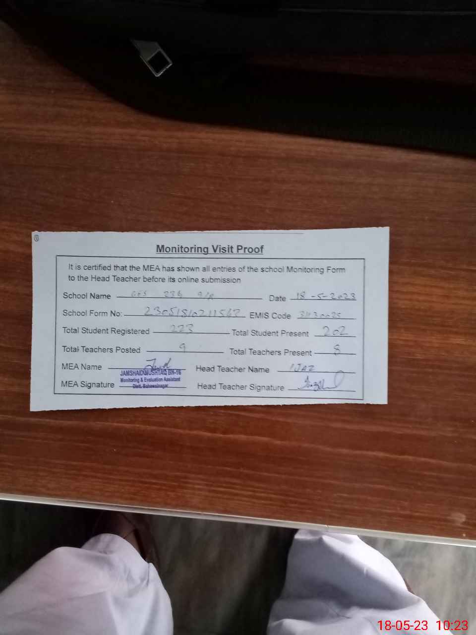 | Attendance Register | Head Teacher | MEA with School | Visit Proof |
